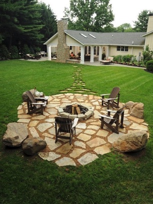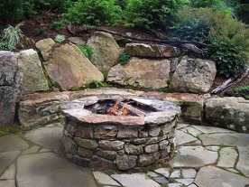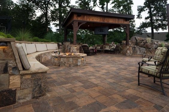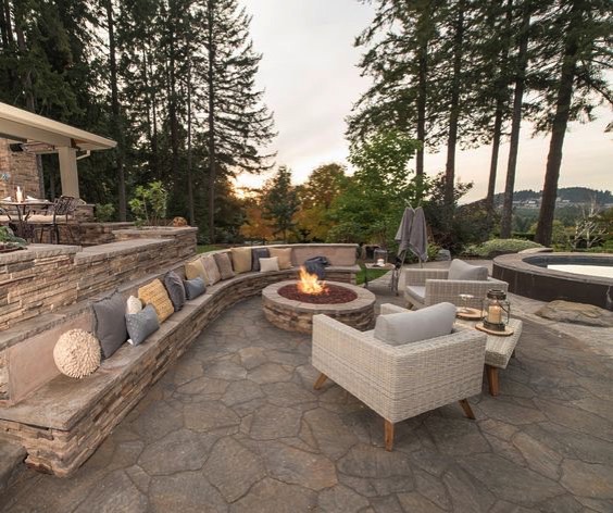 I like the fire pit in picture 1 and I like how part of the seating are cushions placed on the stone seat. I also like the random variation and various colors in the stone pavers.